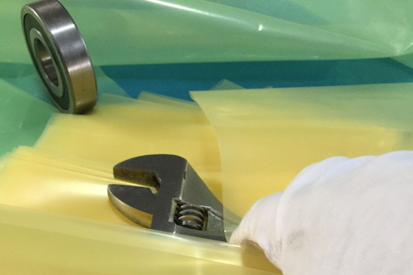 VCI氣相防銹膜(防銹袋)是將高分子聚乙烯樹脂(LDPE)與功能VCI樹脂配比混合,采用現(xiàn)代薄膜共擠技術(shù)生產(chǎn)的新一代復(fù)合防銹薄膜。具有良好的氣化防銹性能、阻隔防潮、使用方便、透明直觀等特點(diǎn);當(dāng)用塑料袋包裹金屬產(chǎn)品時(shí),氣相緩蝕劑在封閉空間內(nèi)氣化并凝聚在所有金屬表面上形成氣相保護(hù)層,從而防止金屬產(chǎn)品銹蝕。符合GB-T19532-2004防銹性能要求。